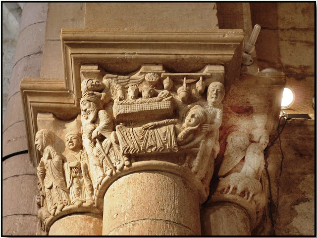 San Juan de Ortega: Iglesia de San Juan de Ortega - Birth (with parts of Annunciation and Visitation at left and Annunciation to Shepherds at right) on Nativity capital (https://www.flickr.com/photos/rabiespierre/8057621709).